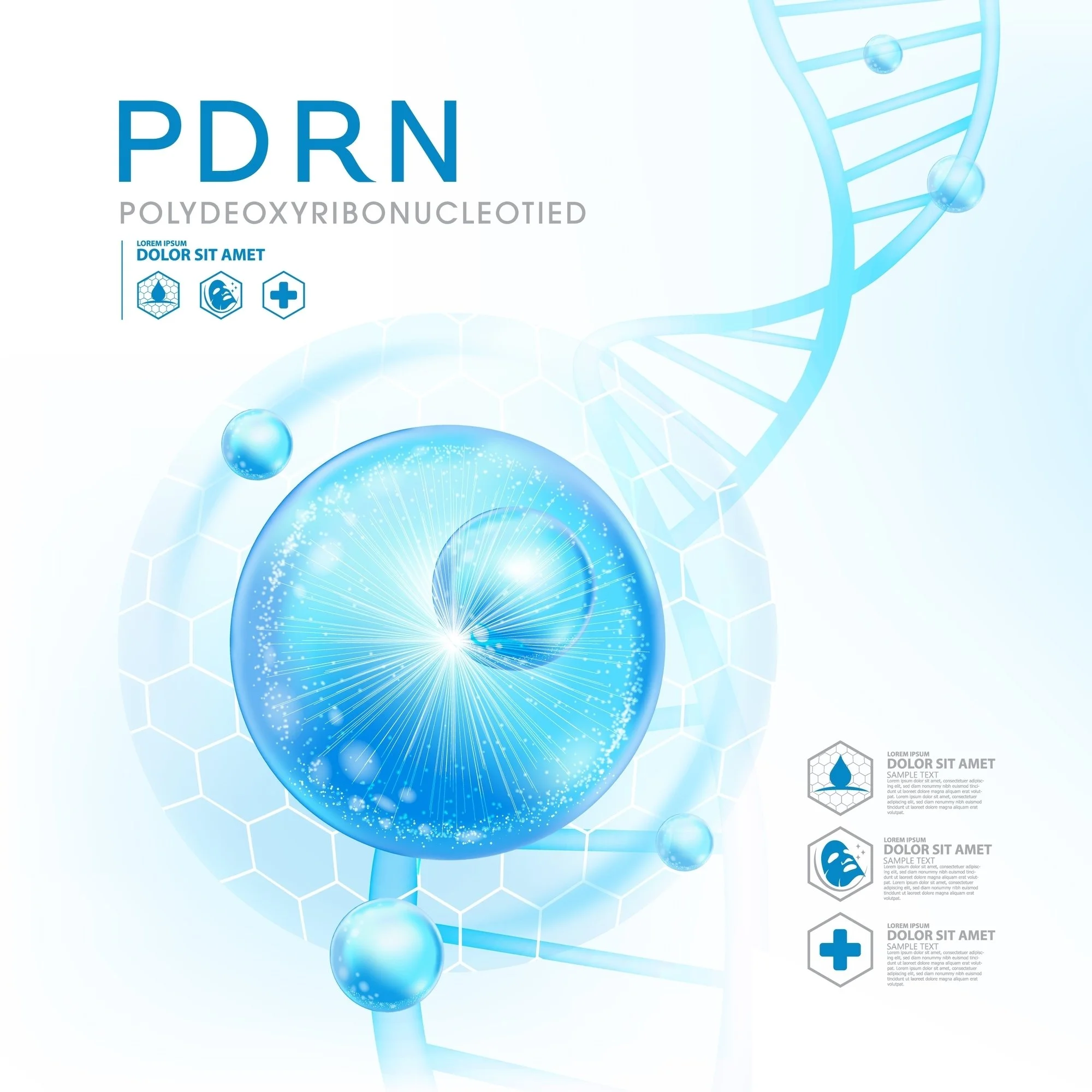 PDRN (Polynucleotides): PDRN is derived from salmon DNA. Salmon DNA is very close to human DNA, making it highly compatible with our cellular functioning. The signals that are sent to the cells are easily understood and utilized quickly.